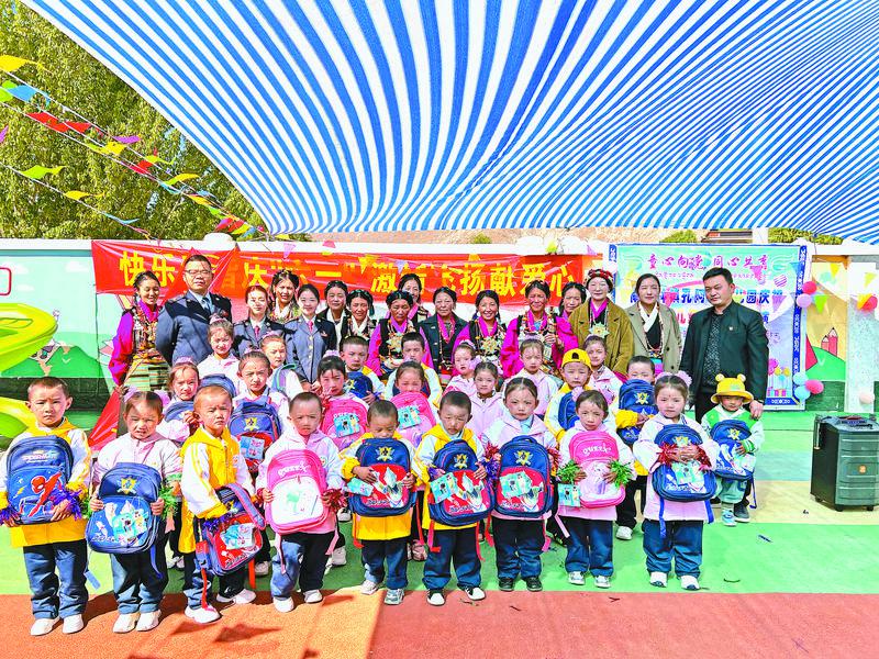圖為(wei) 南木林縣稅務局工作人員與(yu) 孔阿村幼兒(er) 園師生合影。南木林縣稅務局 提供
