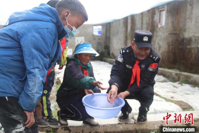 圖為(wei) 民警晉美多吉與(yu) 學生為(wei) 蔬菜澆水。 羅峰 攝