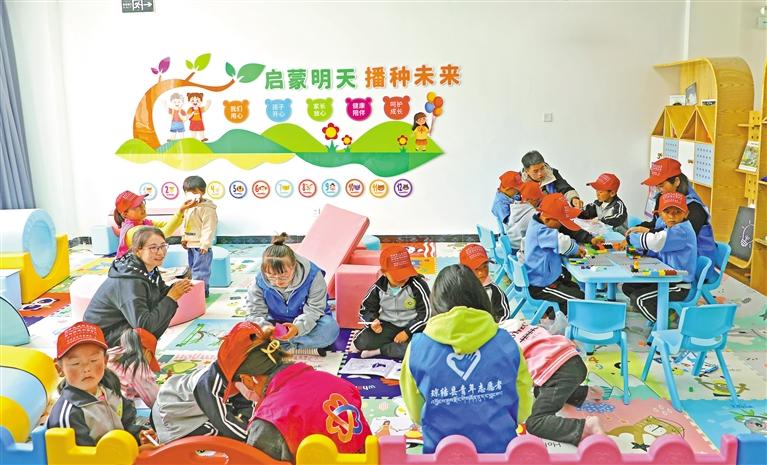圖為(wei) 誌願者陪伴瓊結縣加麻鄉(xiang) 昌嘎村兒(er) 童在該村日間照料中心婦幼兒(er) 童功能區玩耍。記者 劉楓 通訊員 熊起樊 攝