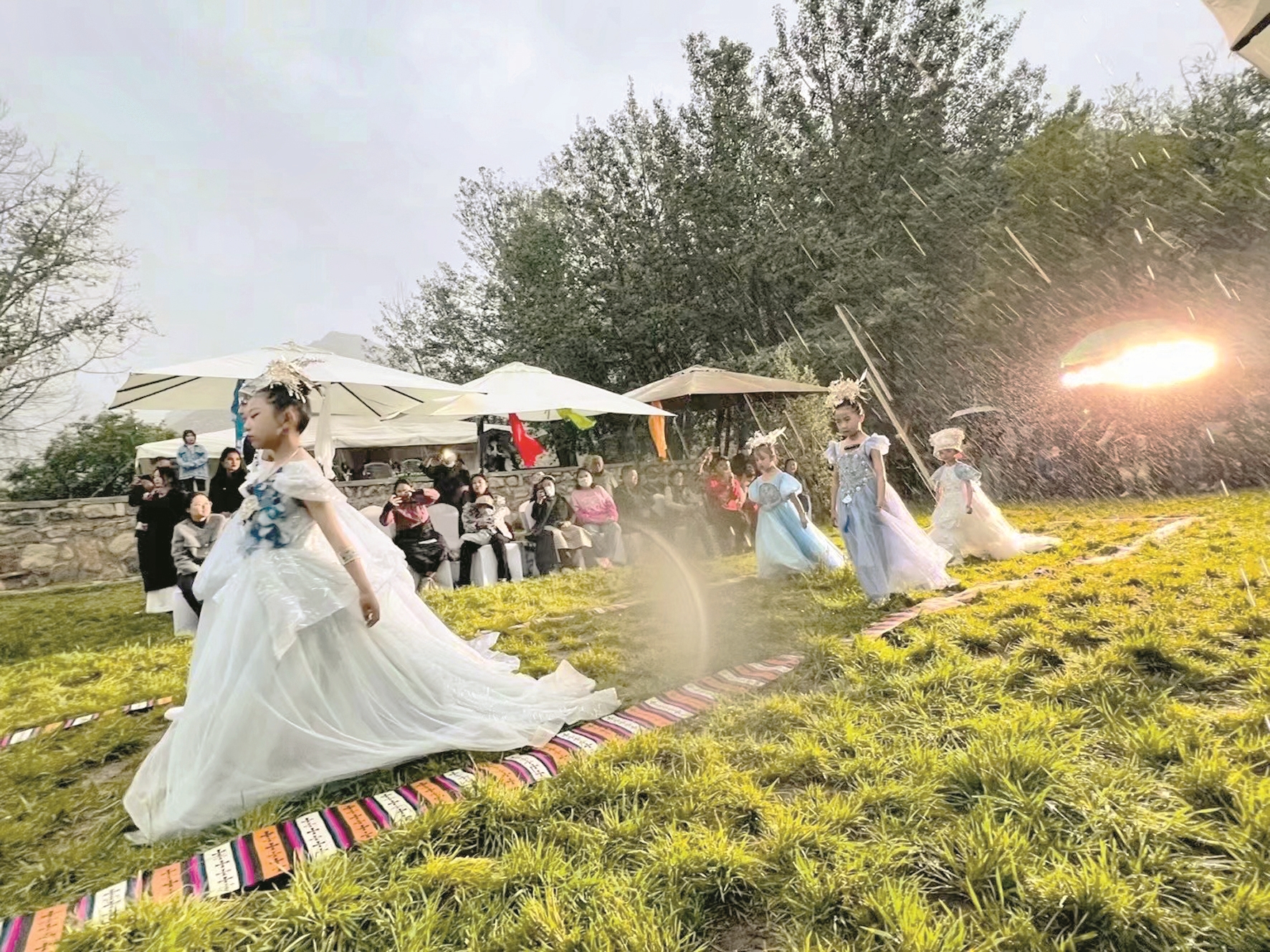 模特秀上,盡管天公不作美下起了雨,但小模特們(men) 跟隨著動感十足的韻律在雨中自信走秀,燃爆全場,極具個(ge) 性色彩的藏族與(yu) 苗族服裝展現了傳(chuan) 統文化與(yu) 時尚設計的交相輝映,凸顯出“傳(chuan) 統與(yu) 新潮”的極度融合,體(ti) 現了“各美其美,美美與(yu) 共”的文化關(guan) 聯。