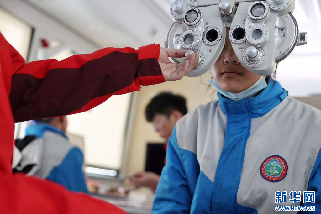 在西藏自治區那曲市色尼區第二中學(杭嘉中學),誌願者用綜合驗光儀(yi) 為(wei) 學生驗光(6月22日攝)。新華社發(趙穎碩 攝)