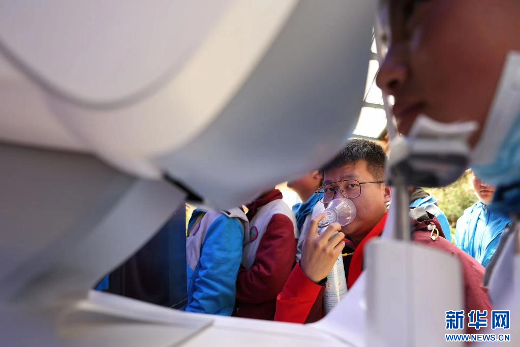 在西藏自治區那曲市色尼區第二中學(杭嘉中學),誌願者陳坤一邊吸氧一邊為(wei) 學生驗光(6月22日攝)。新華社發(趙穎碩 攝)