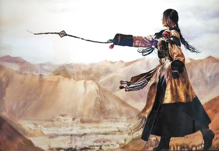 中國畫作品《幸福西藏》運用工筆重彩的繪畫藝術表現形式,描繪了布達拉宮廣場上民族和睦的美好生活圖景。畫麵中,湛藍天空下,藏族群眾(zhong) 與(yu) 遠道而來的各地遊客們(men) 相聚雪域高原,燦爛的笑容映照出新時代西藏人民的美好生活,也反映出西藏自然風光、人文風情對各地遊客的極大吸引力。從(cong) 青年旅行者們(men) 或騎著單車,或舉(ju) 起相機認真拍照的表情,能深刻感受到他們(men) 對美麗(li) 西藏的向往。同時,繪畫作品反映出近年來西藏旅遊事業(ye) 的蓬勃發展以及各族兒(er) 女團結互助、攜手進步的新時代美好生活景象。水彩·粉畫《颯·薩》運用人物特寫(xie) 的藝術創作手法,展現出一位西藏姑娘甩出烏(wu) 爾朵的颯爽姿態;油畫《藏曆新年薩迦禳祈福》以明快熱烈的色彩烘托出當地民眾(zhong) 進行藏曆新年祈福活動的歡樂(le) 場景;油畫《中國玉麥》以紀實敘事的創作方式,描繪了隆子縣玉麥鄉(xiang) 卓嘎、央宗姐妹放牧守邊的故事,畫麵中她們(men) 專(zhuan) 注地懸掛國旗的樸實舉(ju) 動,傳(chuan) 遞出高原姊妹對祖國的深愛之情。