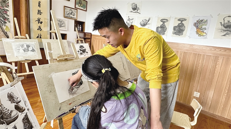“‘西瓜老師’,這個(ge) 麵包是我特意帶給你的,你餓的時候一定吃。”“‘西瓜老師’,你看我今天畫得怎麽(me) 樣?有沒有進步?”“‘西瓜老師’,這個(ge) 地方我不會(hui) 畫,你能不能教教我?”……課餘(yu) 時間裏,陳寶佳經常和孩子們(men) 一起玩耍,慢慢就成為(wei) 了孩子們(men) 的好朋友。陳寶佳說:“雖然平時會(hui) 和他們(men) 在一起說說笑笑,但是上課的時候我還是比較嚴(yan) 厲的。我主要帶素描課,要引導孩子們(men) 打好繪畫基礎、練好基本功,今後他們(men) 才能在繪畫方麵有更多的發展。看到孩子們(men) 畫畫有進步的時候,我會(hui) 覺得很幸福。”