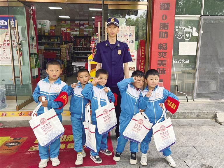 “小小消防誌願者”和消防宣傳(chuan) 員合影。記者 張琳 攝