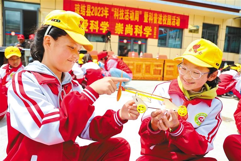 圖為(wei) 瓊結縣拉玉鄉(xiang) 小學學生在對拚裝完成的橡皮筋動力車進行實驗。(資料圖片)記者 白瑪澤旺 通訊員 倫(lun) 珠澤仁 攝