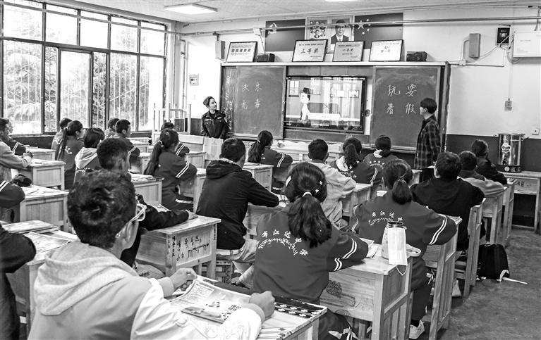 工布江達縣公安局禁毒大隊民警與(yu) 拉薩市職業(ye) 技術學院誌願者在縣中學向學生播放禁毒宣傳(chuan) 片。記者 彭琦 實習(xi) 生 旦增旺姆 攝
