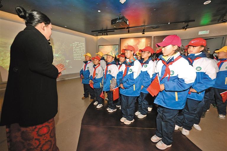 圖為(wei) 拉薩市堆龍德慶區乃瓊中心小學的學生參觀百萬(wan) 農(nong) 奴解放紀念館。記者 潘多 攝