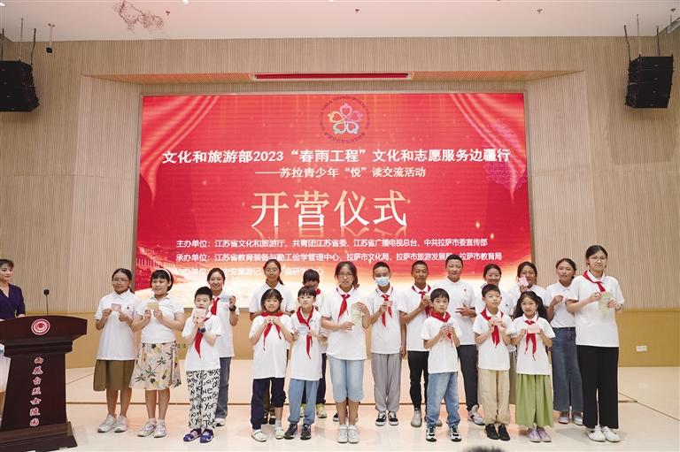 為(wei) 貫徹文化和旅遊部、國家民委2023年關(guan) 於(yu) 文化和旅遊誌願服務邊疆行部署要求,推動落實江蘇省對口援建工作任務,由江蘇省文化和旅遊廳、共青團江蘇省委、江蘇省廣播電視總台、拉薩市委宣傳(chuan) 部聯合主辦,江蘇省教育與(yu) 勤工儉(jian) 學管理中心、拉薩市文化局、拉薩市旅遊發展局、拉薩市教育局聯合承辦,新中安童遊記、夫子廟研學中心協辦的2023年度“春雨工程”蘇拉結對合作項目——蘇拉青少年“悅”讀交流活動開營儀(yi) 式8月7日上午在江蘇省南京雨花台烈士陵園啟動。江蘇省文化和旅遊廳公共服務處副處長陳兵、拉薩市文化局一級調研員範躍平、拉薩市圖書(shu) 館館長朱純琳、新中安童遊記常務副總裁餘(yu) 靜等參與(yu) 單位領導嘉賓以及來自拉薩的10名青少年和江蘇本地的10名青少年一起參加了開營儀(yi) 式。