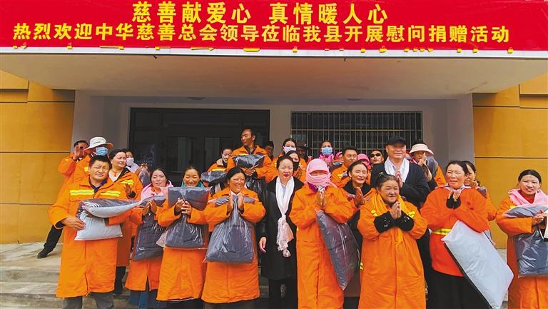 近日,中華慈善總會(hui) 項目部工作人員來到拉薩市當雄縣開展慰問捐贈活動,為(wei) 當雄縣環衛工人、納木錯水廠工人送去121件保暖衣物。