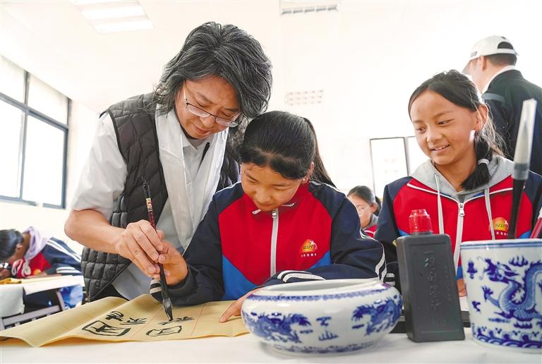 圖為(wei) 山東(dong) 省青島市書(shu) 法名家手把手教日喀則市桑珠孜區一中學生學習(xi) 書(shu) 法。記者 汪純 通訊員 王建亮 攝