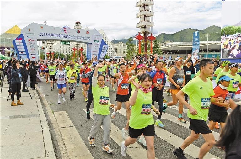 8月27日,2023拉薩半程馬拉鬆在拉薩市鳴槍開跑。賽事設置半程馬拉鬆、競速跑(10.520公裏)、健康跑(5公裏)三個(ge) 組別。來自全國各地的約4000名馬拉鬆愛好者參加比賽。經過激烈角逐,索朗才仁和次仁措姆分別以1小時10分3秒和1小時23分48秒的成績撞線,雙雙衛冕男、女子組半程馬拉鬆冠軍(jun) 。