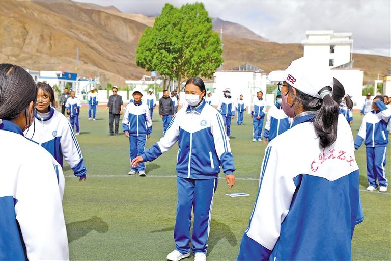 圖為(wei) 措美縣中學學生在操場上跳“熱巴吉念”元素課間操。記者 巴桑旺姆 攝