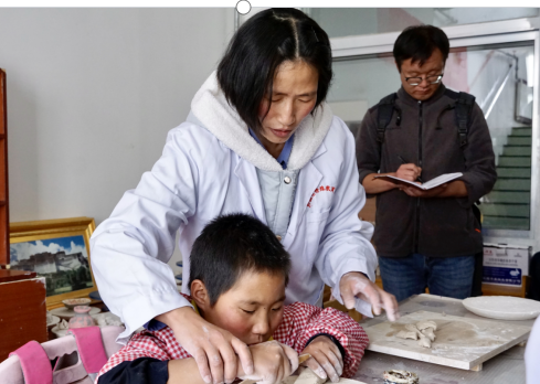 圖為(wei) 陶藝室內(nei) ,陳雙燕和學生在捏泥巴。