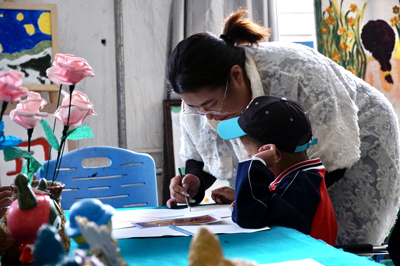 圖為(wei) 培智美工教室內(nei) ,在特教老師輔導下繪畫的學生。