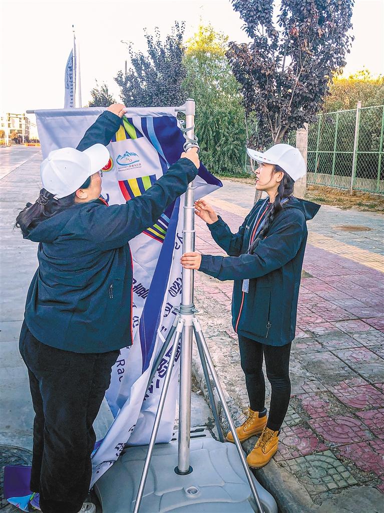 圖為(wei) 誌願者在比賽起點擺放刀旗。記者 楊子彥 蔣翠蓮 攝