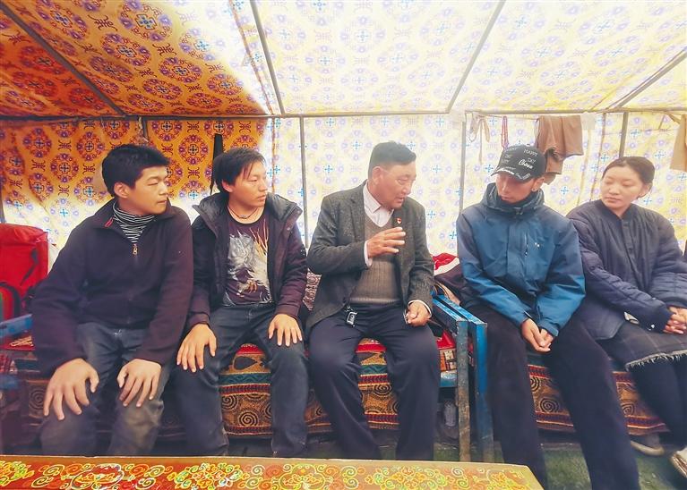 圖為(wei) “全國模範人民調解員”紮西次加(中)在那曲市比如縣恰則鄉(xiang) 孔瑪奪村蟲草采集點向群眾(zhong) 宣講法律知識。