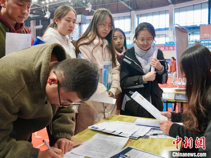 圖為(wei) 招聘會(hui) 現場,畢業(ye) 生正在填寫(xie) 信息。 劉洋 攝