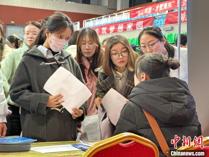 圖為(wei) 招聘人員為(wei) 大四畢業(ye) 生介紹相關(guan) 崗位信息。劉洋 攝