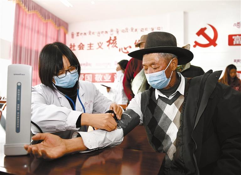 圖為(wei) 拉薩市青年誌願救援隊的醫護人員為(wei) 群眾(zhong) 測量血壓。記者 旦增蘭(lan) 澤 攝