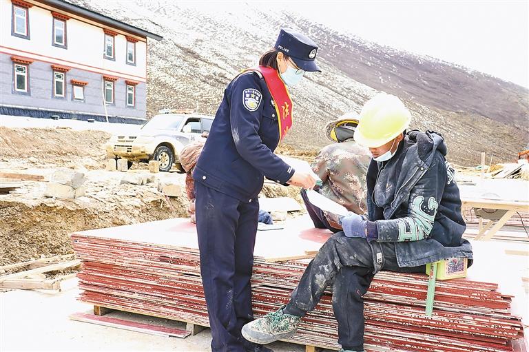 帕裏邊境派出所民警在轄區工地開展憲法宣傳(chuan) 周普法宣傳(chuan) 活動,並發放憲法宣傳(chuan) 資料。 記者 汪純 通訊員 白瑪倉(cang) 覺 攝