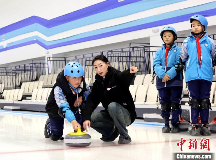 圖為(wei) 學生們(men) 練習(xi) 冰壺投擲。薛蒂 攝