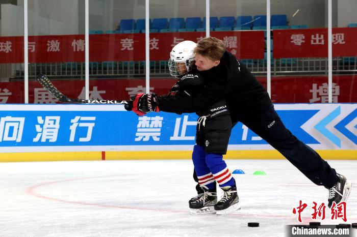 圖為(wei) 外籍教練手把手教學冰球射門。薛蒂 攝