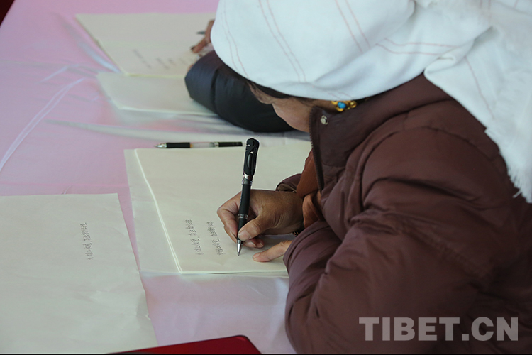來自拉薩市當雄縣羊八井鎮的仁青白姆在本次大比武中獲得了書(shu) 法作品二等獎,她穿著一身極具當雄特色的服飾參加今天的活動。“我雖然沒上過學,但平時忙完牧活,有機會(hui) 就去上夜校學習(xi) 藏語文和普通話等課程,也很喜歡利用閑暇時間在家裏練習(xi) 藏文書(shu) 法,沒想到這次能夠獲獎,這是一份榮譽,也是一份鼓勵,我會(hui) 繼續堅持學習(xi) 。”仁青白姆臉上露出甜美微笑。
