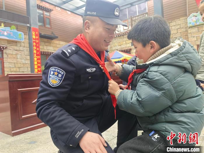 圖為(wei) 小朋友正在為(wei) 玉麥邊境派出所民警佩戴紅領巾。紮西根培 攝