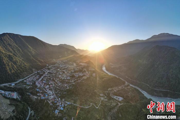 圖為(wei) 12月19日傍晚,西藏林芝市墨脫縣城日落風光,畫麵右側(ce) 為(wei) 雅魯藏布江。(無人機畫麵)中新社記者 江飛波 攝