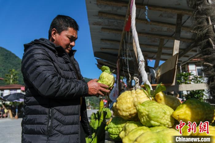 12月19日,48歲的門巴族次仁旺加在家門口馬路邊碼放大檸檬,這些墨脫特產(chan) 主要向路過的遊客銷售。中新社記者 江飛波 攝