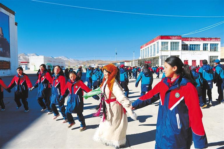 措勤縣中學黨(dang) 建辦副主任次旺曲珍告訴記者,將非遺“磁石帕卓”改編成“磁石彈舞”課間操,主要就是以一種新潮的形式讓學生在健身的同時,充分感受非遺文化魅力。這不僅(jin) 豐(feng) 富了學生的課間活動,鍛煉了學生身體(ti) 、培養(yang) 了民族情感、增強了民族自信心,而且使措勤縣特有的非遺文化得到了傳(chuan) 承。