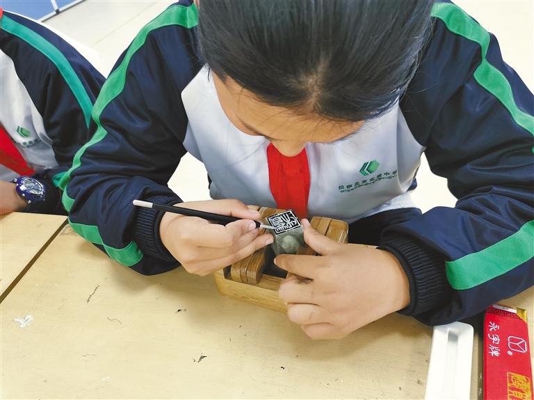 圖為(wei) 學生學習(xi) 篆刻技法。
