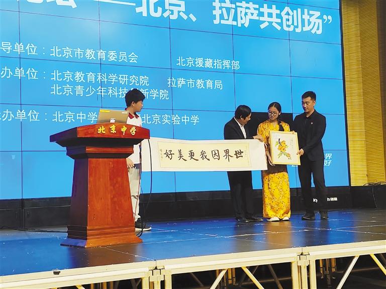 圖為(wei) 拉薩北京實驗中學學生向友好學校贈送禮物。