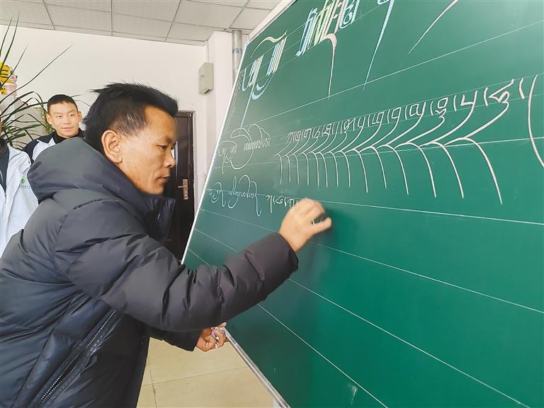 拉薩北京實驗中學教師洛桑多吉精通藏文書(shu) 法,有著豐(feng) 富的傳(chuan) 統藏文書(shu) 法教學經驗,他堅持長期輔導學生,讓學生在書(shu) 法練習(xi) 中陶冶性情,靜心修身;在書(shu) 法進益的過程中感受傳(chuan) 統文化的魅力,提升學習(xi) 能力。