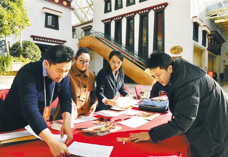 圖為(wei) 參加西藏自治區兩(liang) 會(hui) 的政協委員在駐地領取證件和會(hui) 議資料。記者 旦增蘭(lan) 澤 攝