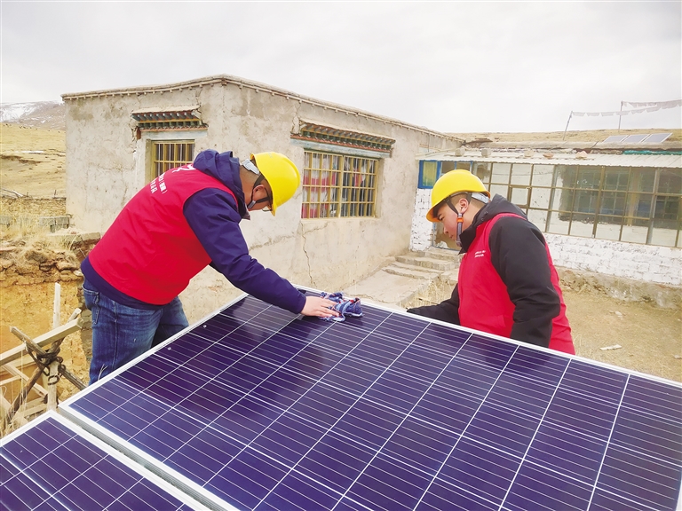 “次桑在家嗎?我們(men) 過來看一下你們(men) 新年準備得怎麽(me) 樣了?”聽到劉光輝的呼喚,孩子們(men) 都跑出來迎接這位“小黃帽”叔叔。劉光輝和羅桑歐珠進屋放下年貨,顧不上休息,立馬搭梯子爬上次桑家的房頂,用抹布拂去光伏電板上的塵土,拿出工具仔細檢查電源和光伏設備是否有損壞。“次桑家用的是我們(men) 的第一代太陽能光伏電板,這個(ge) 電板要經常擦拭,保持表麵幹淨,發電效率會(hui) 更好。”劉光輝說。檢修完光伏電板後,劉光輝和羅桑歐珠又回到屋內(nei) 檢查次桑家的電路線路,對插排插座等可能存在安全隱患的地方進行認真排查。確保沒有問題後,兩(liang) 人將之前昏暗的燈泡全部換成了最新的節能燈泡,整個(ge) 屋子一下亮堂了起來。