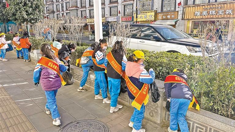 圖為(wei) 拉薩市第一小學小小誌願者們(men) 沿街清掃。記者 格桑倫(lun) 珠 攝