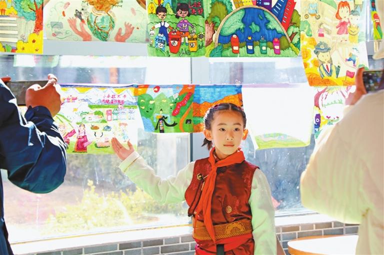 圖為(wei) 榮獲繪畫小學組一等獎的城關(guan) 區雪小學學生與(yu) 她的作品。