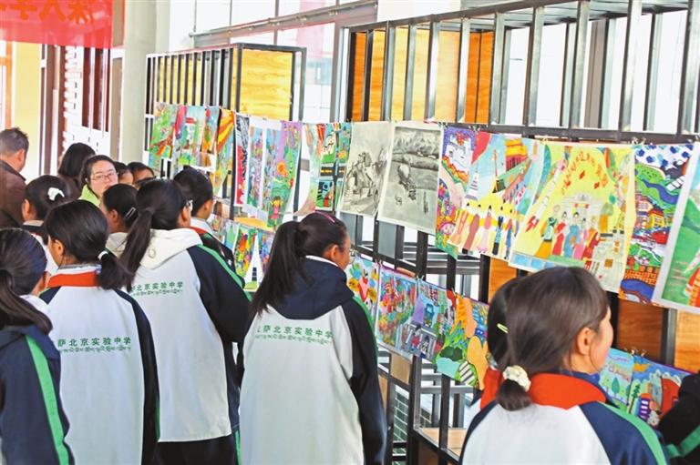 圖為(wei) 拉薩北京實驗中學學生參觀書(shu) 畫展。記者 格桑倫(lun) 珠 攝