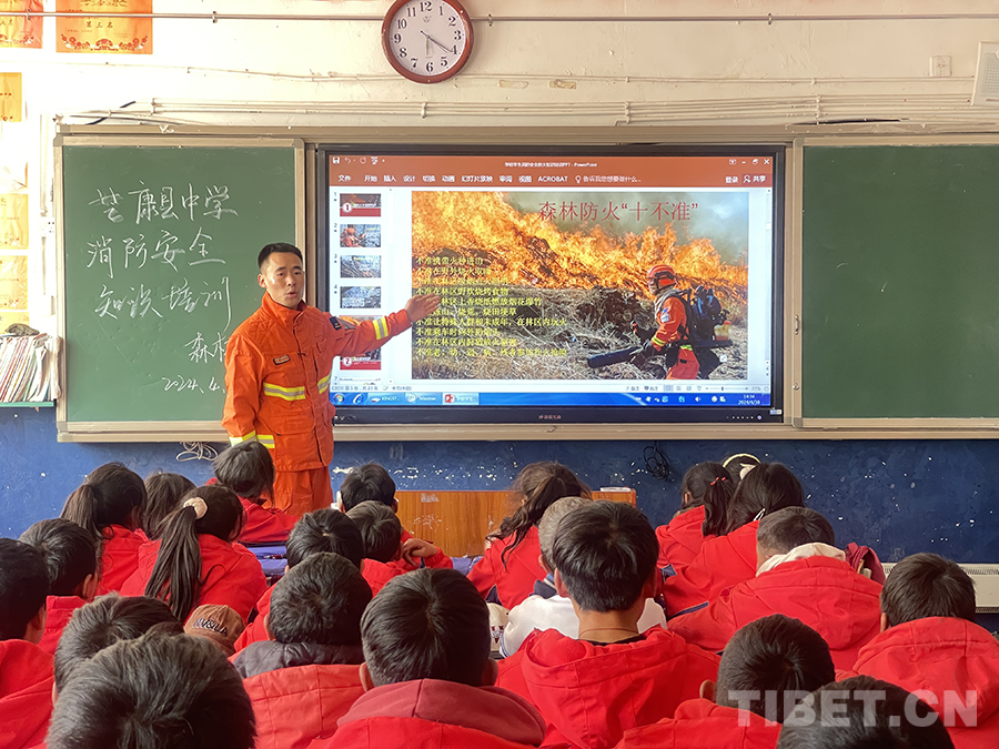 在芒康縣中學授課現場,芒康縣森林消防分隊負責人夏能向全校師生講解森林防火的重要意義(yi) 、火災的起因、相關(guan) 法律法規和常用防火知識等,教育引導同學們(men) 樹立森林防火意識,做到不帶火種進山,發現火情及時報警。