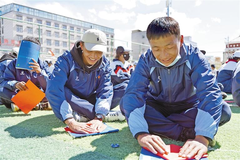 圖為(wei) 學生們(men) 正在做“高山流水”團隊遊戲。記者 溫凱 攝