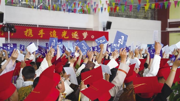 拉薩市第四高級中學校長陸彭飛表示,今天的畢業(ye) 典禮不是結束,而是同學們(men) 追夢之旅的又一個(ge) 開始。在大家準備揚帆遠航的時刻,他想對孩子們(men) 說,帶上勤奮和刻苦去追夢,帶上規則和自律去追夢,帶上勇氣和毅力去追夢。“孩子們(men) ,你們(men) 已經步入成年。成人,絕不是簡單的年齡上的增長,它意味著你的生命被賦予更崇高的責任和使命。請大家相信,沒有比人更高的山,沒有比腳更長的路。麵對即將來臨(lin) 的高考,希望大家在最美麗(li) 的青春之年,為(wei) 自己的理想、為(wei) 自己的未來奮鬥拚搏!”