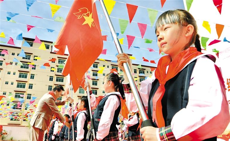 5月30日,拉薩市在實驗小學東(dong) 城分校舉(ju) 行以“紅領巾愛祖國”為(wei) 主題的一年級新隊員入隊儀(yi) 式暨“紅領巾獎章”五星章頒章儀(yi) 式。儀(yi) 式現場,老隊員們(men) 鄭重地為(wei) 新隊員佩戴紅領巾,大隊輔導員帶領新老隊員宣讀入隊誓詞,隊員們(men) 激情唱響《我們(men) 是共產(chan) 主義(yi) 接班人》,嘹亮的歌聲在校園回蕩。