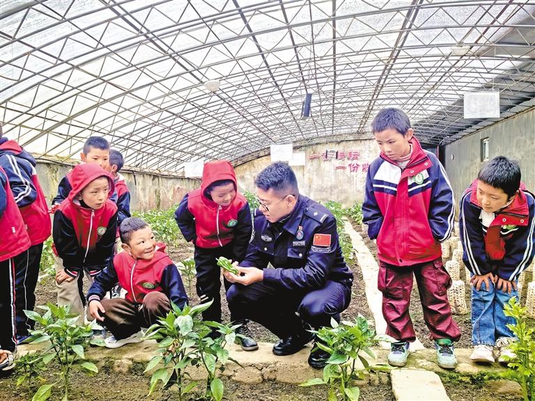 圖為(wei) 民警與(yu) 轄區內(nei) 的小學生一起采摘蔬菜。次旺曲珍 記者 紮西頓珠 攝