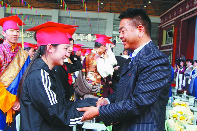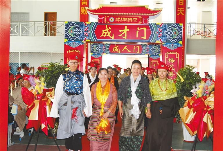 圖為(wei) 老師和父母牽著孩子們(men) 的手一同走過成人門、成才門、成功門。記者 央金 攝