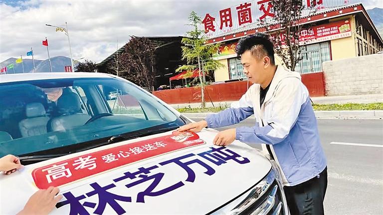圖為(wei) 愛心車車主在張貼“愛心送考車”貼紙。