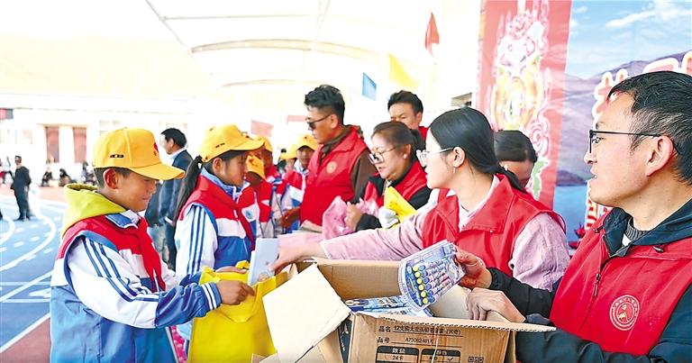 圖為(wei) 誌願者在向學生們(men) 分發學習(xi) 用品。記者 丹增平措 攝