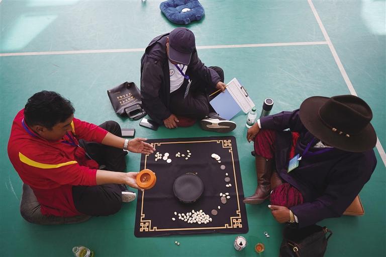 當日,“吉韌”“秀茲(zi) ”等項目一同開賽。 “吉韌”也叫藏式克郎球,是藏族的一種彈指運動。比賽在一張邊長約1米的正方形木桌球台上進行,球台四角有4個(ge) 小洞,黑、白兩(liang) 種扁圓形球子各9個(ge) ,另有1個(ge) 紅色球子放置在球台中心,1個(ge) 白色母球供雙方彈擊球子所用。