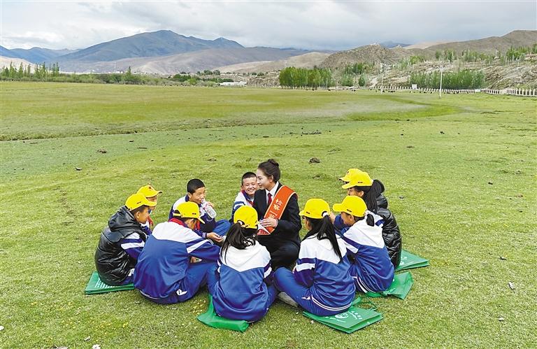 日前,曲鬆縣人民檢察院的檢察官在下落國家濕地公園舉(ju) 行“法治小課堂”,為(wei) 學生沉浸式講授濕地保護領域公益訴訟典型案件及政策法規。記者 丹增平措 攝